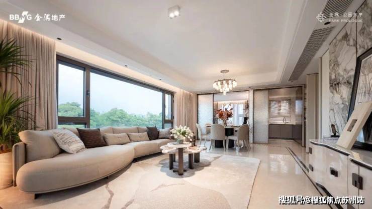 格局上更以公园为景,打造270°三面景观环绕的“超级客厅”,7.5米阔尺横厅衔接双向270°公园框景窗,形成难得一见的环幕视野,让生活时刻被风景环绕.