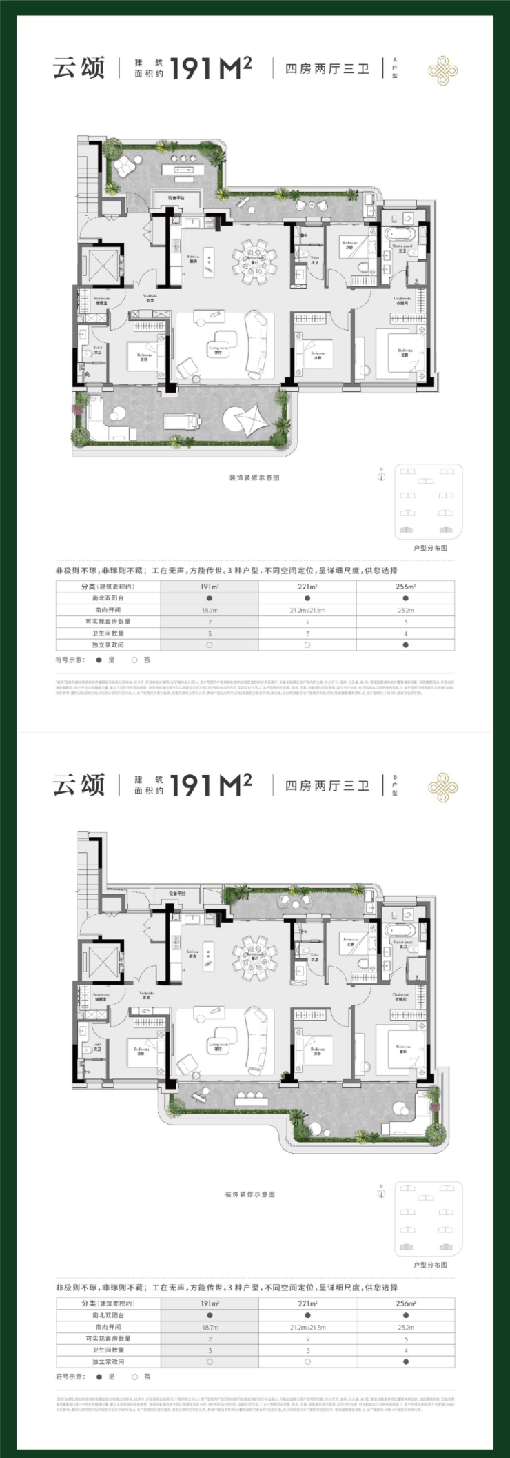 建筑面积约256㎡,4房2厅4卫 每种户型都做到了格局方正、功能完善,是真正为城市峯层人士量身定制的生活场域,是苏州湾新房市场中极具竞争力的产品。