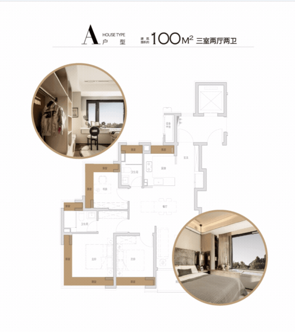 100㎡户型,双270°飘窗设计(南向主卧+北向书房),南次卧、厨房、双卫飘窗,厨房烟道外移,飘窗配置抽屉,极致空间利用率。