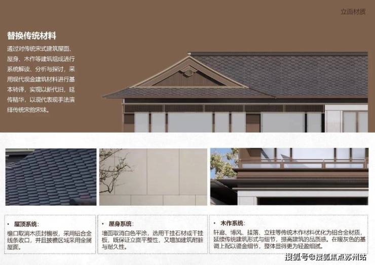 在建筑材质的选择上严格把关,打造真正意义上的”好房子“。屋顶系统采用铝合金线条替代木质封檐板,增强了结构稳定性和耐久性。金属屋面确保了防水、防风和隔热性能。屋身系统使用干挂石材或板材,保持建筑立面平整美观,提升抗污性和使用寿命。传统木结构被铝合金替代,保留传统风格的同时提升品质感。