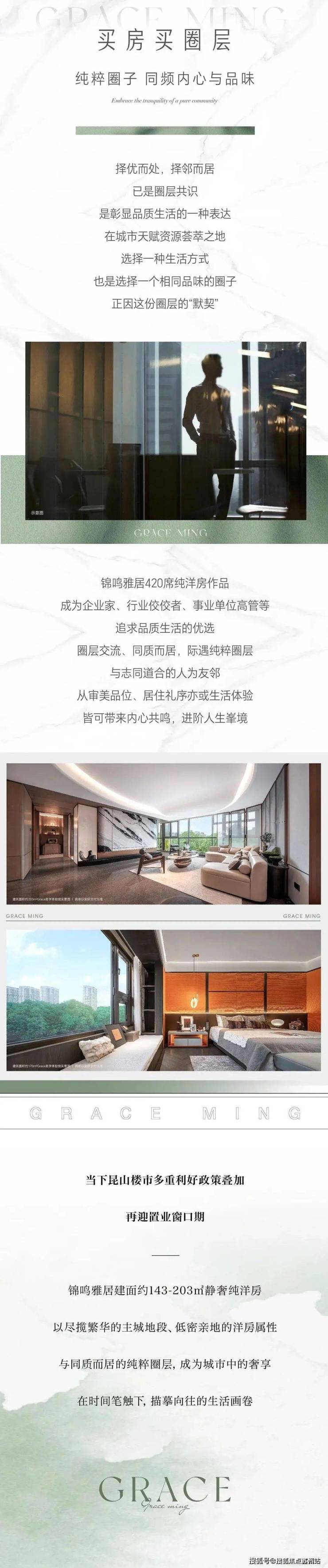 本项目推广名为“锦鸣雅居”,备案名为“锦鸣雅居”;开发公司为:“昆山市嘉恒房地产开发有限公司”;商品房预售证:“(2024)预售准字第083号”;销售代理公司为:“苏州新源整合营销有限公司昆山分公司”、“苏州迪赛基业不动产服务有限公司”。| 本宣传资料所宣传内容,尺寸数据均为轴线尺寸 | 本宣传资料所涉宣传内容,不在任何意义上构成开发商的承诺与要约,具体以政府部门审定的规划设计文件及商品房买卖合同的约定为准 | 本资料所发布的内容有效期1个月,本公司有权对宣传内容进行修改、调整,敬请留意最新宣传资料。| 本户型为锦鸣雅居建筑面积约203m²Grace美学体验馆的装修及家居布置示意图,仅供购房参考,室内装修、家居、陈设设计布置等特殊注明之外均不属于交付标准。丨具体以实际交付为准。丨广告。