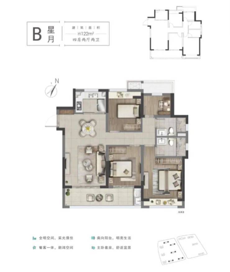 建筑面积约122㎡,四房两厅两卫,全明通透,三面采光,环幕观景。约6.7米宽景阳台,双卧飘窗设计,独立功能间,为生活带来更多可能。