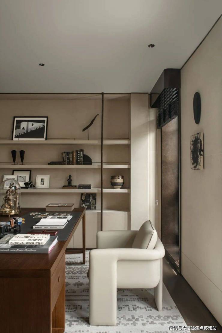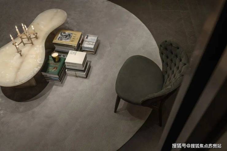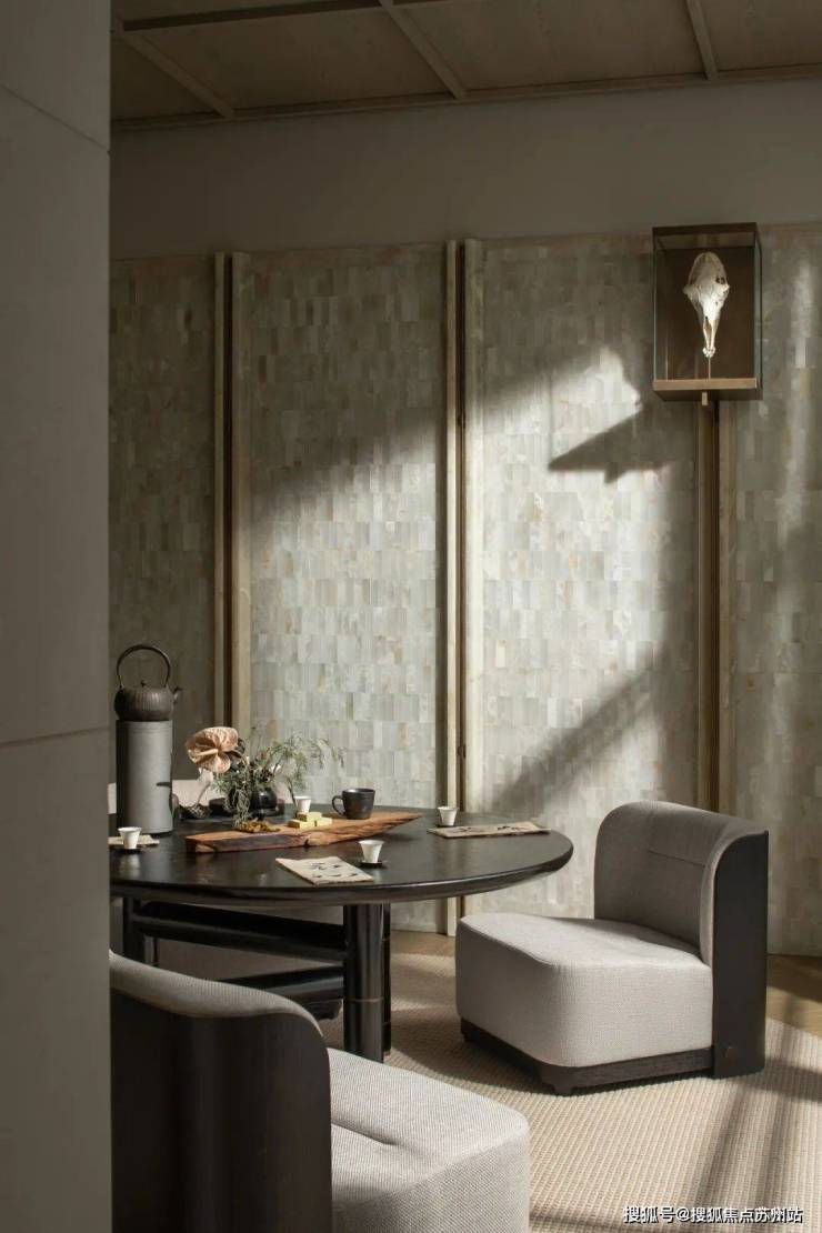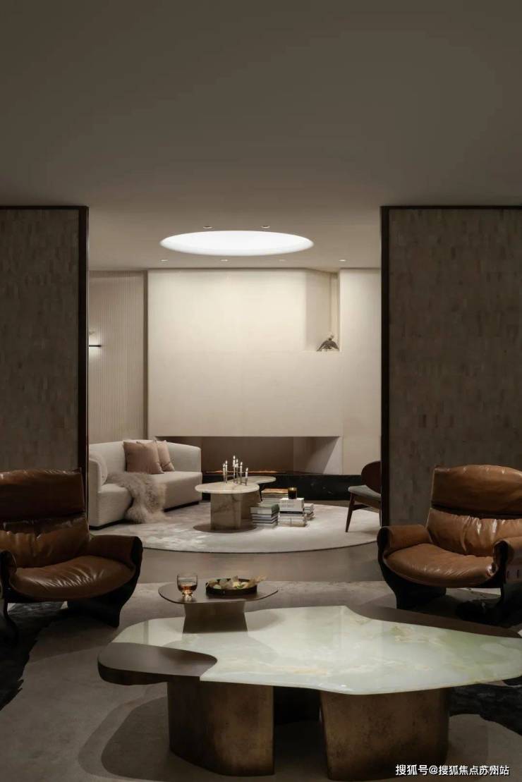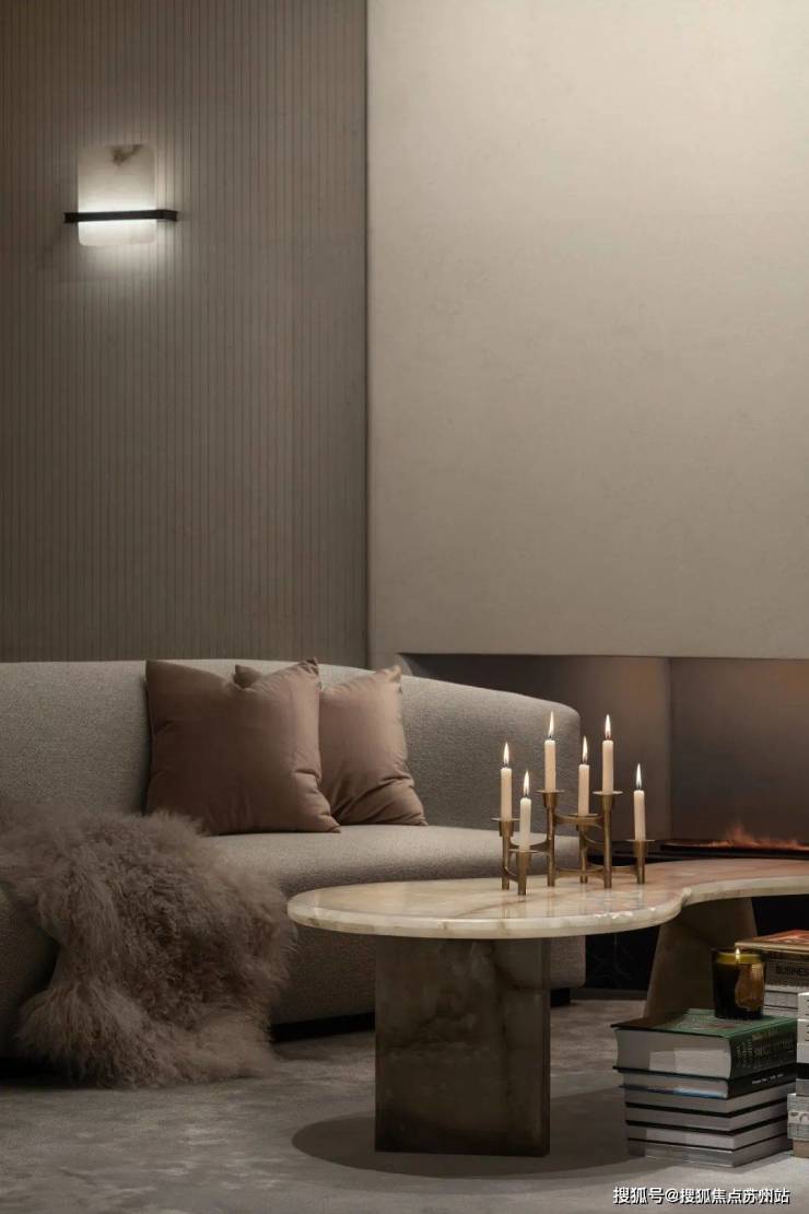 麂色沙发之后是一个半开放的博物馆空间,浅色的布面沙发,温暖的壁炉,配上充满复古情调的玉色茶几和金属烛台,是独处阅读、三五知己浅酌闲谈的最佳私密空间,空气中淡淡的熏香味松弛而宁静。