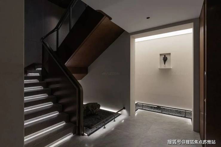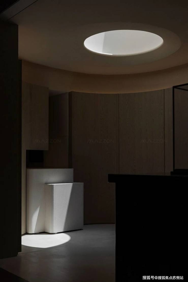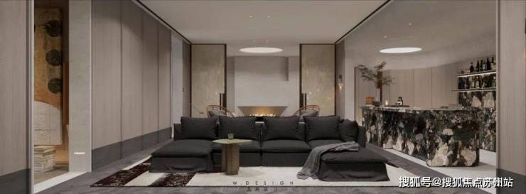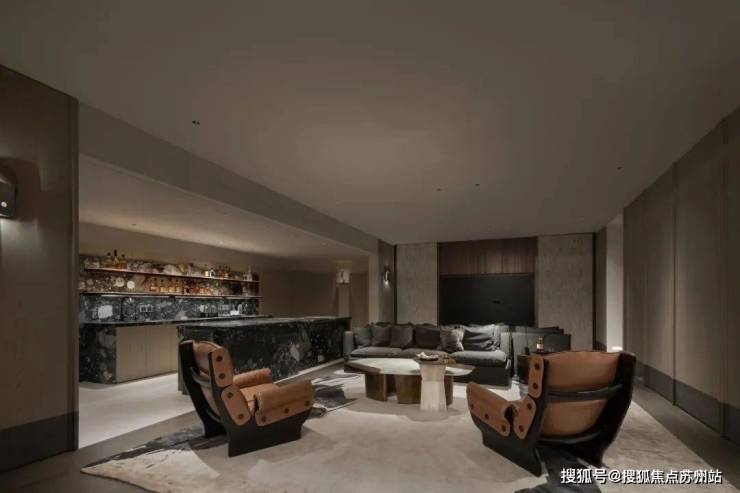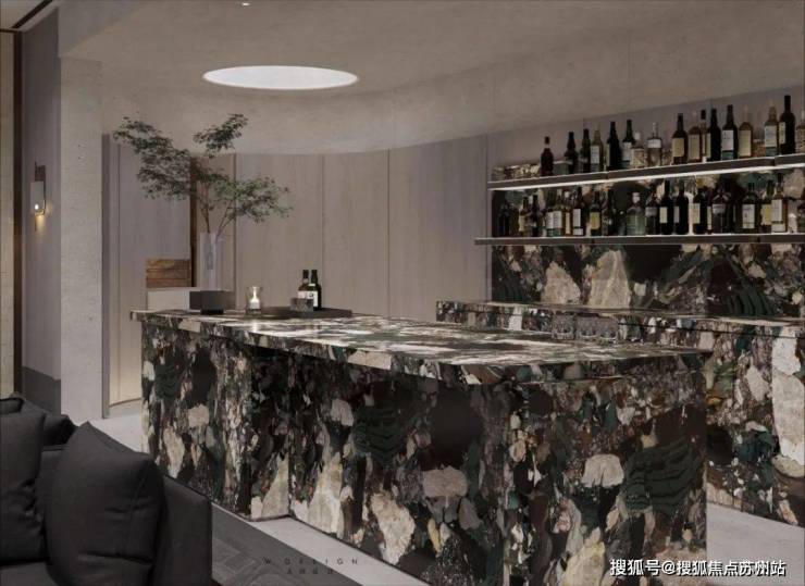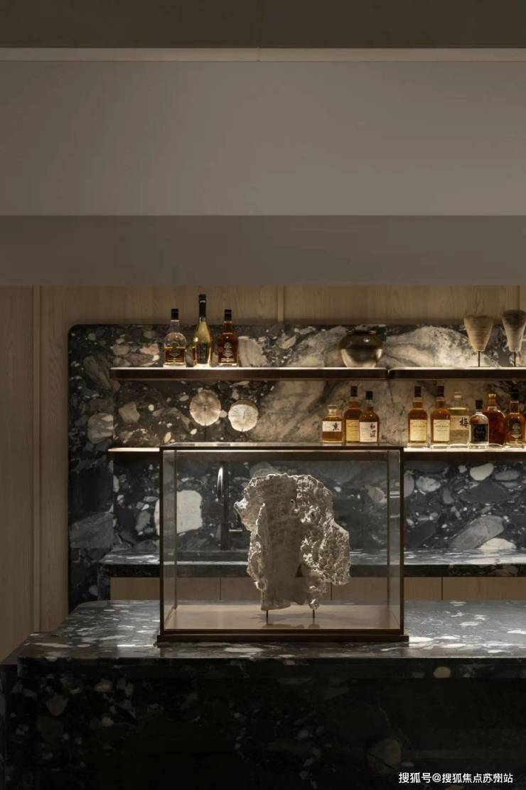 负一层的主要空间由沙龙和酒吧区构成。开放式的吧台中,灰色玛瑙般的大理石面斑驳似海浪,柜墙上流金的酒液散发着柔和的光,给人恰好的温度。整个洽谈空间典雅而不失深沉气度,低调而奢华。