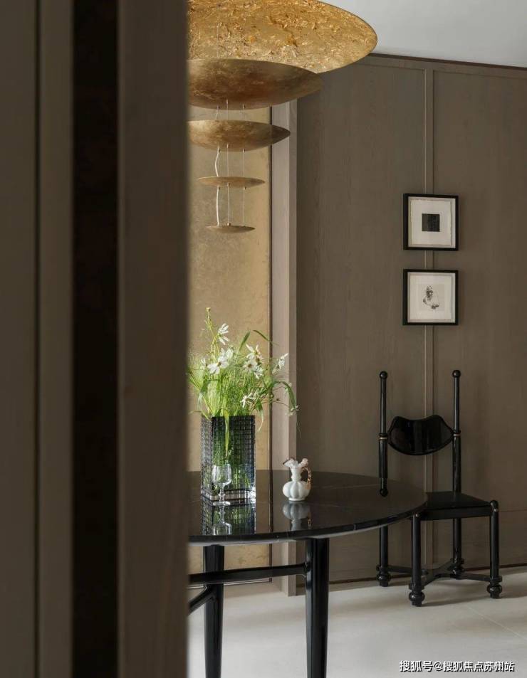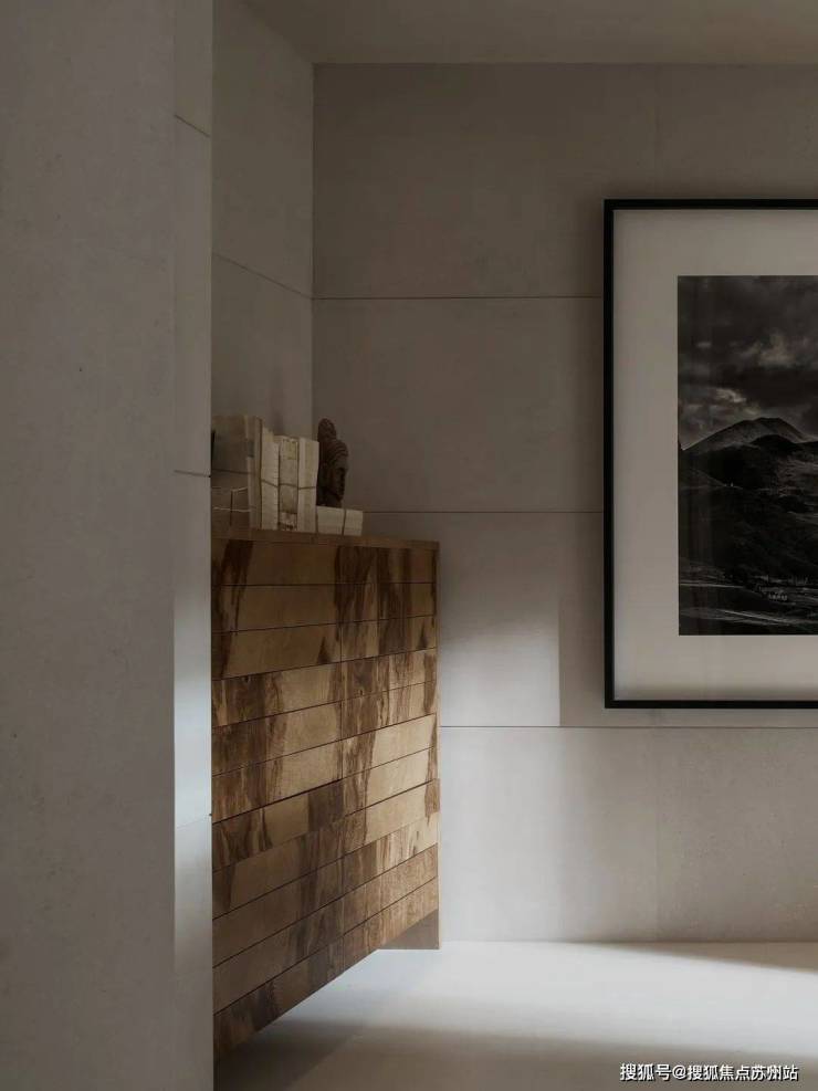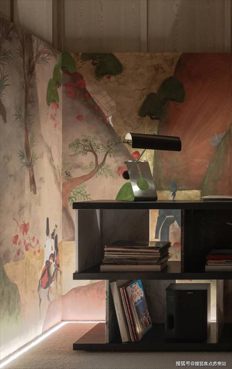 沙龙的一角通向主人的音乐厅,越过略显隐谧的入口向内窥探,视线刚好落在《看》这幅岩彩作品上。画笔与色彩交织奇思,象征着一个精神性空间的开端。进入音乐厅内,空间顿感开阔。耳边缓缓流动的音乐,如同是夜晚宁静的和弦。