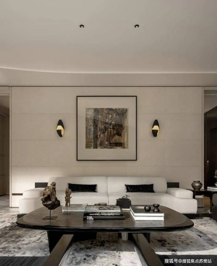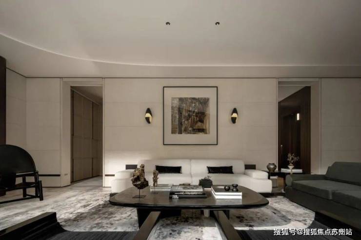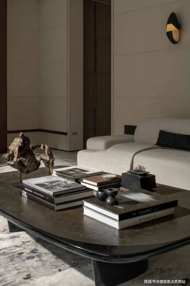 客厅的主沙发来自无间「海上」系列,月白色与黛色巧妙地呼应了空间内的大漆案几。同样出自无间设计的泼墨地毯,使整个底部空间蕴含无尽的诗意。临案而坐,阅书鉴古,后方正挂着的《无题》画作与底部泼墨空间相照应,使居者包围在宁静自由的东方绘画意境之中,闲散而舒适。