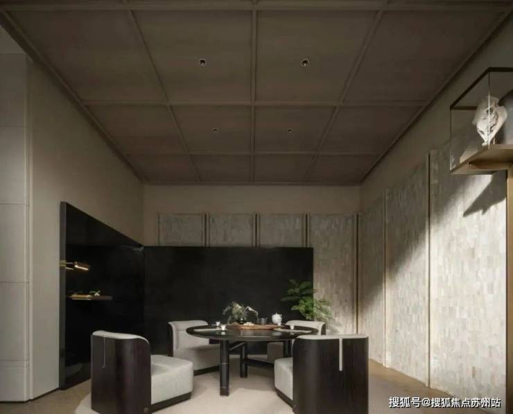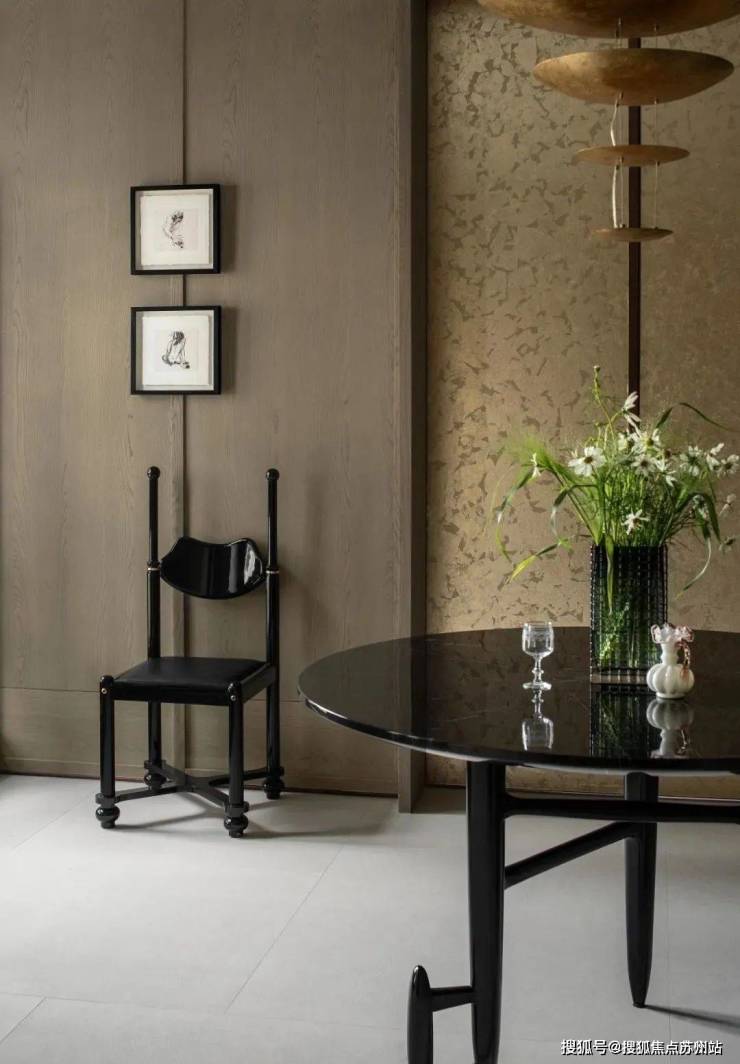 墨色的茶几上凝视细看,黄铜蚀刻台面的肌理变化不息,与桌上造型有致的木雕摆件呼合相应,暗生趣味。