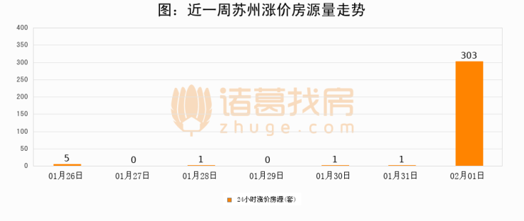根据诸葛找房数据显示,苏州24小时涨价房源量为303套,较01月31日增加302套,环比上涨30200%。与此同时,涨价房源占比小幅扩大,业主信心有所提升。