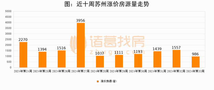 从调价房源来看,第33周苏州涨价房源986套,较上周下降36.7%。与此同时,33周涨价房源占比回落0.82个百分点,业主信心小幅波动,购房者可则需入市。