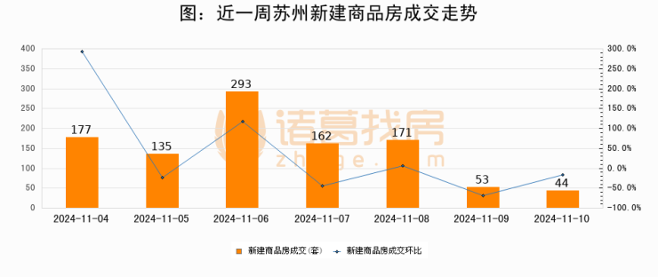 根据苏州市房地产市场和交易管理中心数据显示,2024年11月10日苏州新建商品房成交44套,较昨日减少9套,环比下降17%