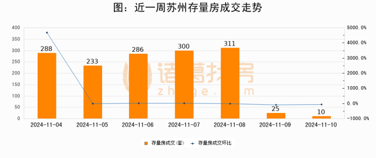 从存量房来看,2024年11月10日苏州存量房单日成交10套,比昨日减少15套,环比下降60%。从近一周存量房成交来看,苏州存量房日均成交套数为207套,11月10日单日成交10套,低于近一周平均水平95.2%。