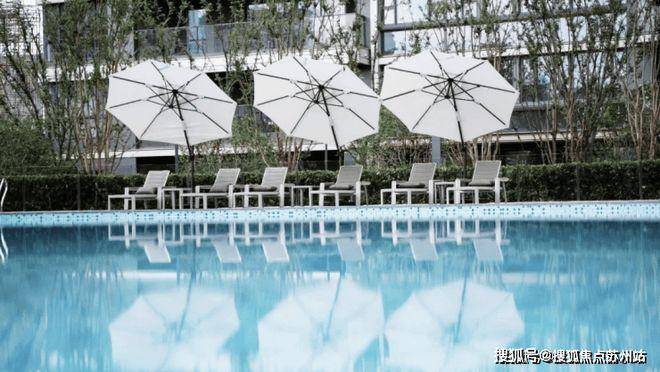●比如,戏水池旁精心搭配了造型躺椅,遮阳伞与湖水、绿树,营造出轻松休闲感。