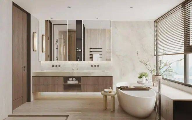 主卫南向,是市面上三房里少见的三面宽朝南、主卫也朝南的产品。并且配置了奢享五件套(独立式落地浴缸、唯宝设计师款智能马桶、淋浴间、双台盆),一应俱全。同时加载美妆冰箱功能,满足女主人在卫生间化妆的需求。