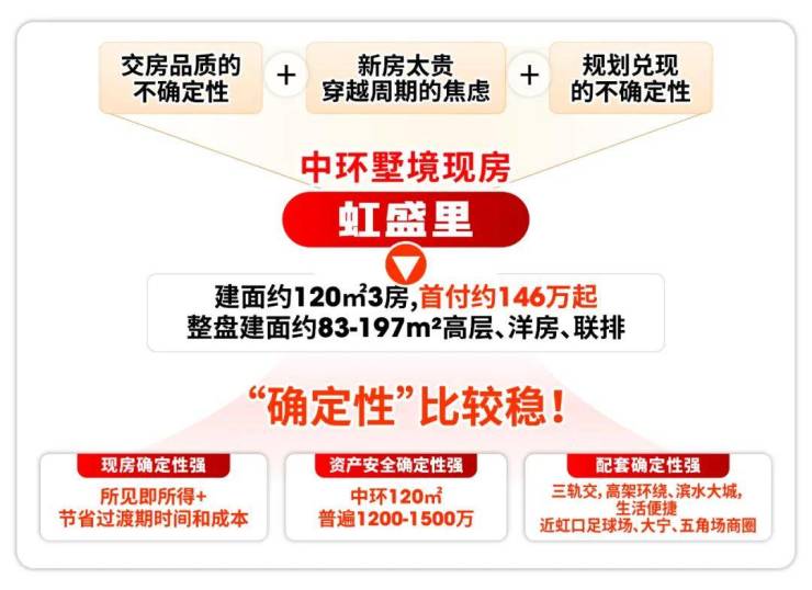 虹口虹盛里,便是当下“确定性”尤为靠谱的选择——当下首付最低15%,首付仅约146万起就能在中环旁入手建面约120㎡的3房墅境现房!