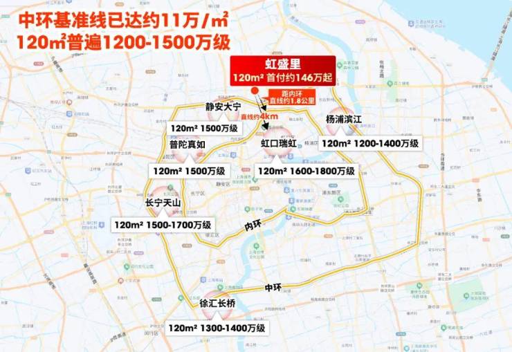 大宁、真如120㎡3房总价达1500万级,长宁天山更是高达1500-1700万级,徐汇长桥、杨浦滨江(内中环)也需1200-1400万级。