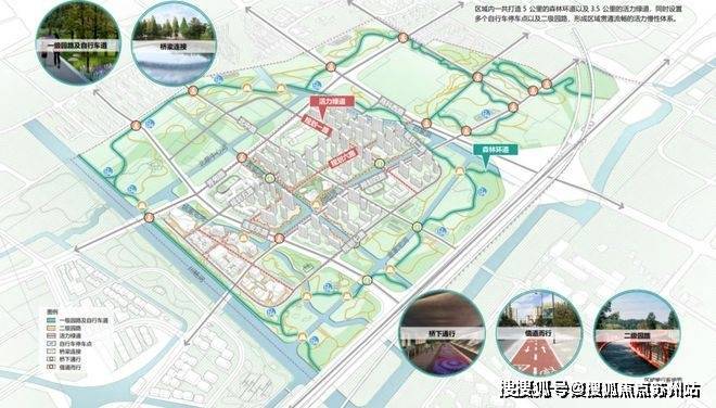 5公里森林环道以及3.5公里活力绿道,部分街区通过桥梁进行衔接,联系被市政道路割裂的绿地,使绿地成为一个整体,车流量大的城市道路交叉处慢行系统桥下通过。