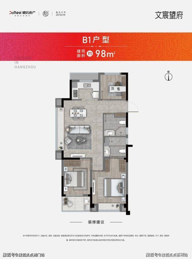 在建面约98方的中间套户型中,文宸望府采用了三开间朝南的设计,媲美市场上建面约120方以上的大户型。