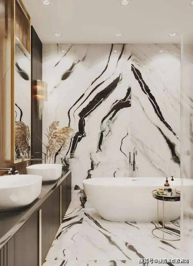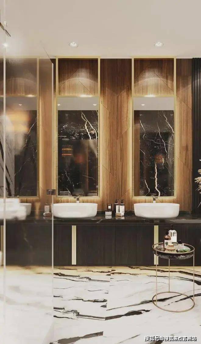 在STUDIA54的设计项目中,浴室特别引人注意.这个项目也不例外,双人洗手台,Eichholtz的灯和“Panda”的大理石,在逻辑上延续了公寓的主题.