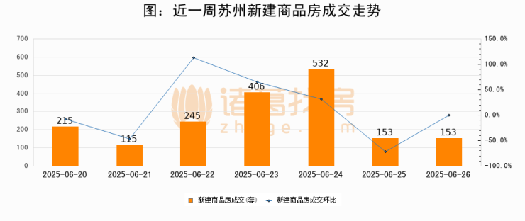 根据苏州市房地产市场和交易管理中心数据显示,2025年06月26日苏州新建商品房成交153套,较昨日持平