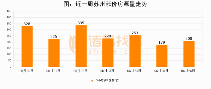 根据诸葛找房数据显示,苏州24小时涨价房源量为208套,较06月25日增加29套,环比上涨16.2%。与此同时,涨价房源占比小幅扩大,业主信心有所提升。
