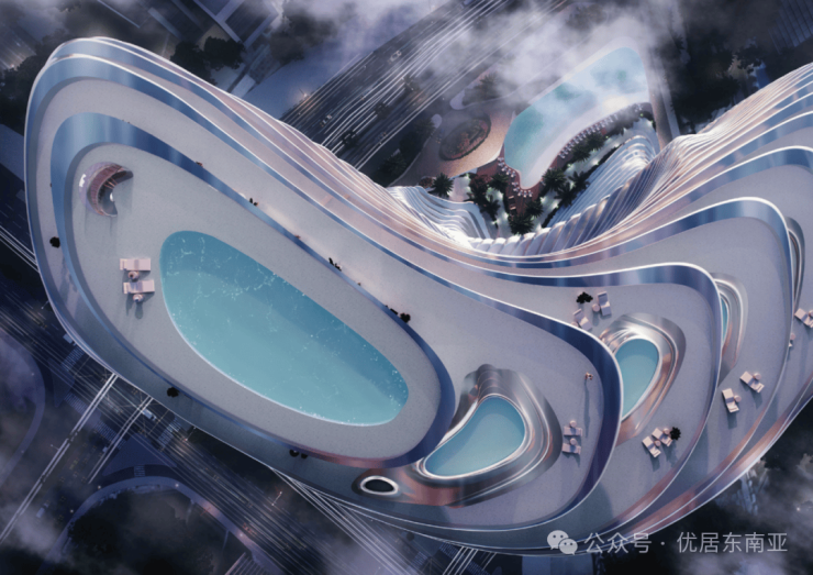 高层和顶层的泳池巧妙地错落布置,高耸在云端,仿佛犹如天宫瑶池一般令人留连忘返。泳池的材料展现出鲜明的金属质感,似乎与地面完美融合,消除了边界感,营造出一种无限延展的视觉效果。