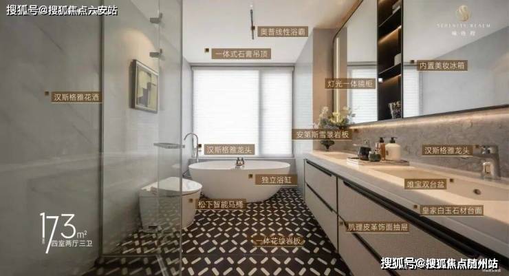 卫浴间采用灯光一体镜柜、肌理皮革饰面抽屉,主卫镜柜还内置美妆冰箱……