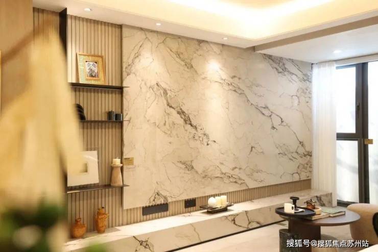 客厅、卧室墙面全部是墙布交付,除了美观外,柔和的触感是涂料所没有的。电视背景墙也是岩板交付,不规则的纹路显得唯美又特别。