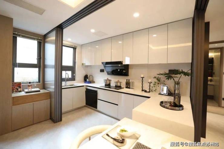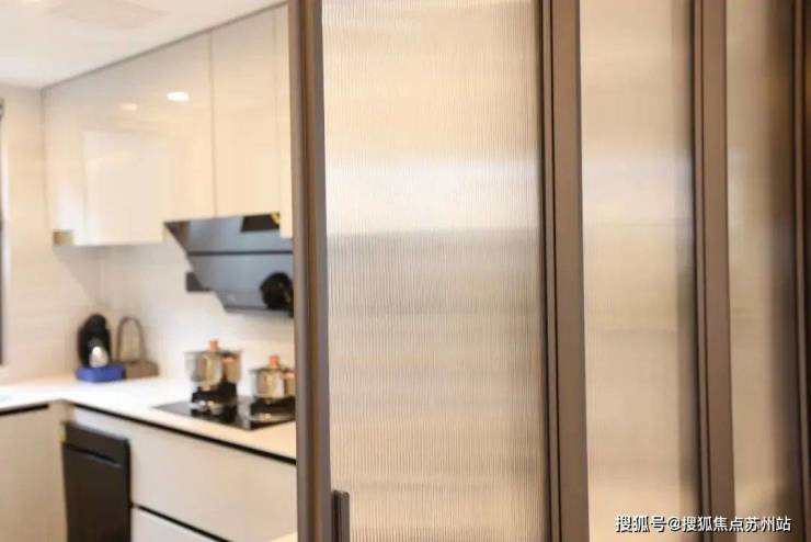 我们来看看最能体现品质的厨房,玻璃移门采用的瓦楞玻璃,起到半遮掩的效果,又能保持空间通透性。还有厨房贴面的瓷砖,项目特地精选900*1800mm的大板砖,减少缝隙,不仅美观,还能更好的保持清洁。即使制作工艺成本不低,金地嘉峯汇也都为业主安排了。