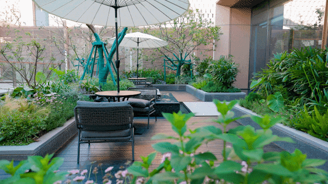 项目社区配套非常丰富,包括堂客厅、下沉庭院的泛会所、林下会客、架空层等。