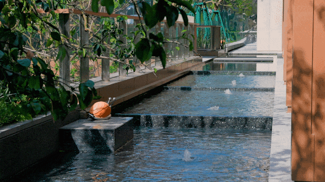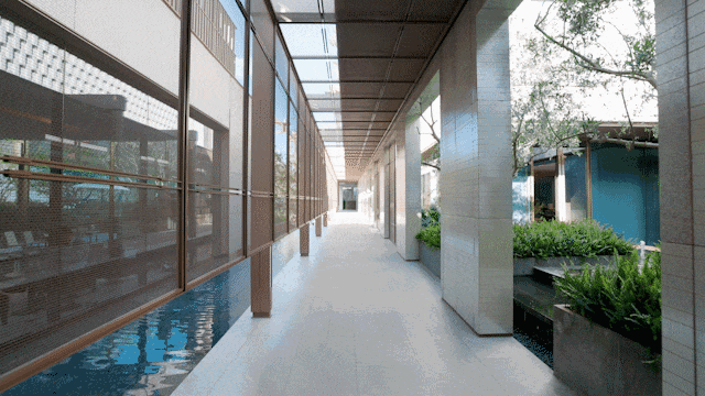 移步来到水榭光廊,阳光透过格栅在地上形成斑驳的光影,与单侧的水景波动的涟漪互动,让归家动线景观更加生动。