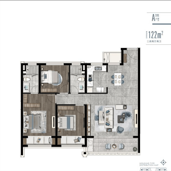 房子里面长啥样? 项目主打建筑面积约105㎡、122㎡和127㎡的经典三房。户型设计非常讲究,做到了南北通透、全明采光。像约127㎡的户型,三开间朝南,阳光洒满客厅和卧室;餐客厅一体连通大阳台,显得特别宽敞;主卧带独立卫生间,私密性很好;U型厨房做饭顺手,还有双卧飘窗,看风景、晒太阳都特别惬意。真正做到了面积零浪费,每一平米都用来提升居住品质。