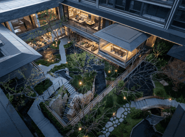景观设计灵感源自豫园,通过“亭-桥-溪”元素重构现代城市版“新豫园”,形成可游、可望、可居的立体山水画卷。
