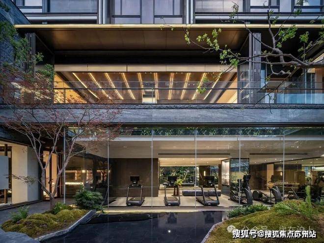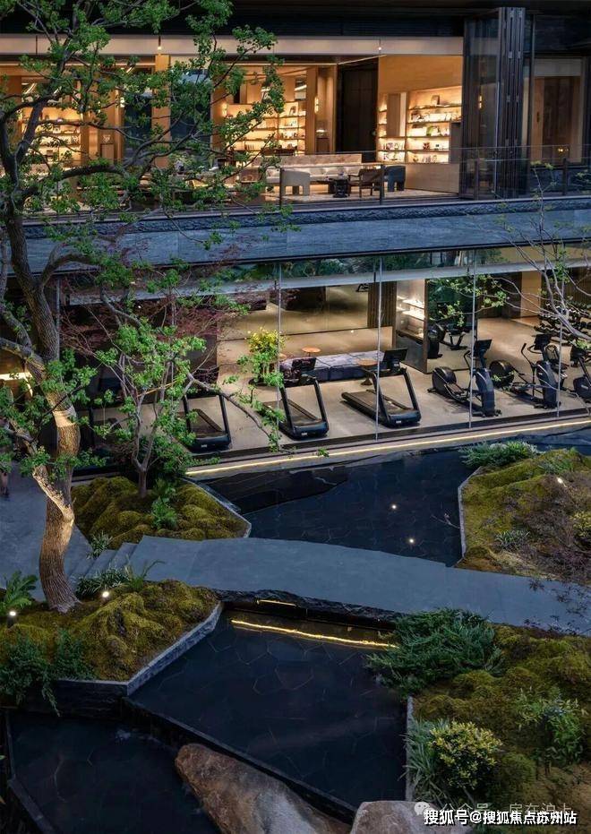 地下区域的健身房直面庭院景观,每台跑步机都正对玻璃中轴,满足"强迫症"用户的极致体验;