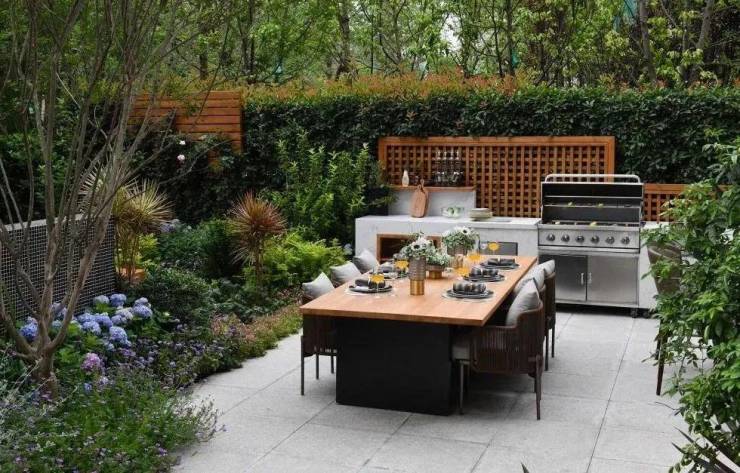 面约197㎡排屋 一层装修示意图,非交付标准。庭院空间仅供展示,实际为小区绿地用途,院内绿化、装修及物品均不属于交付范围。