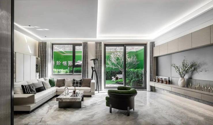 走进建面约197㎡的排屋样板房,扑面而来的不仅是阳光和新鲜的空气,还有轻奢阔绰的居住质感。