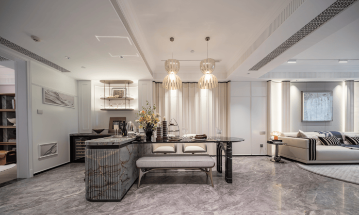 更好更奢的归家门庭,嘉佩乐酒店风格,海派元素充满空间的每一个角落,地面的复古花纹,金属镂空装饰墙,普拉达绿的奢石点缀,仿佛穿越到了摩登时代。