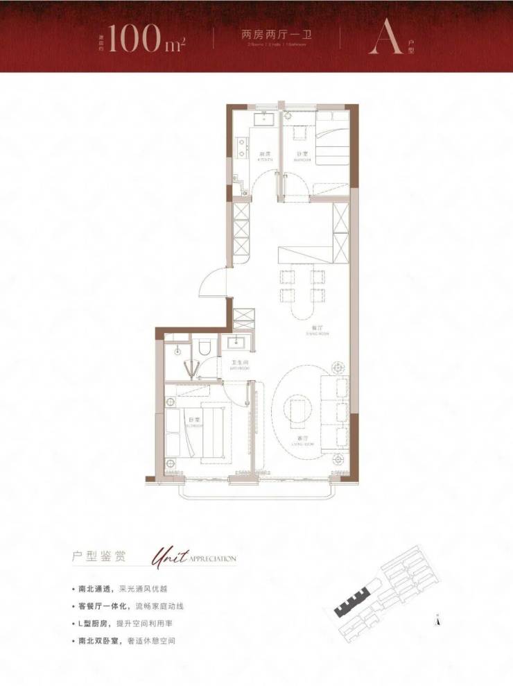 建面约100m²大2房户型,带来的不仅是方正的布局,也为购房者带来了体验感超绝的视野和采光。