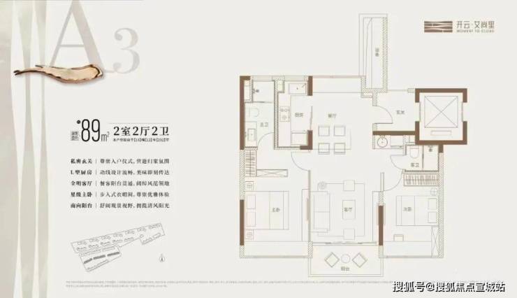 开云艾尚里的户型主打的就是宽绰,洋房本身的高得房率+电梯双开门带来的类一梯一户体验,让约89㎡2房的室内空间非常宽绰,并且可以做2卫的设计,主卧套房,保证了主人的私密空间。