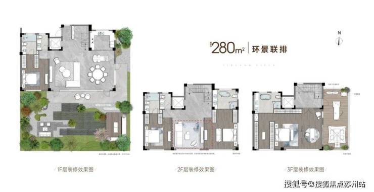 建面约170平的环景联排则更加注重家庭生活的实用性,一层餐客一体的敞阔社交区,加上有天有地的超大庭院,无论是家族聚餐还是举办晚会都能轻松满足,充分展现了别墅的气派。二层南向的双套房均配备独立卫浴间,平等地满足每位家人的需求。三层整层都是主人卧室,并且附赠超大面积露台,为业主提供了私享的休闲空间。