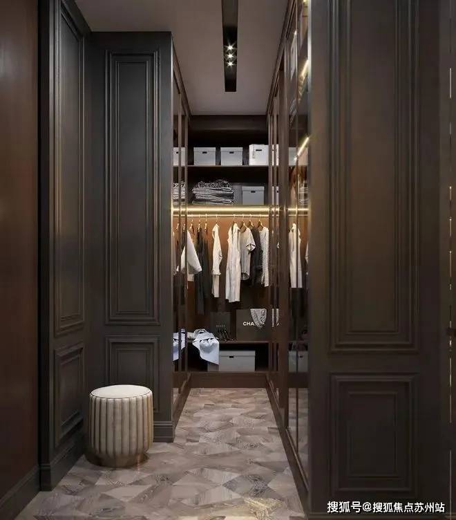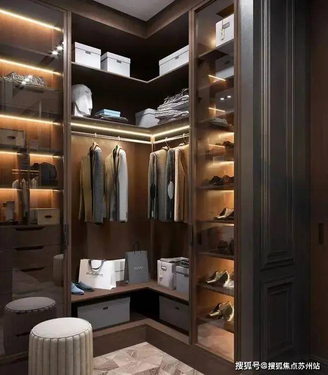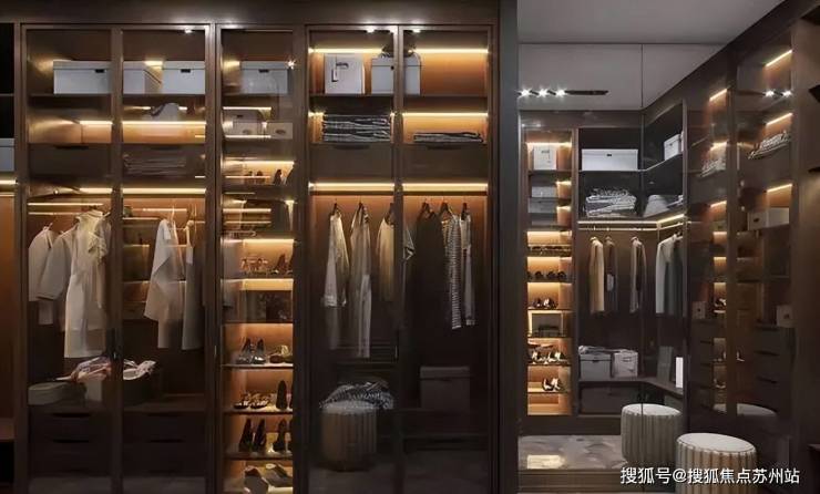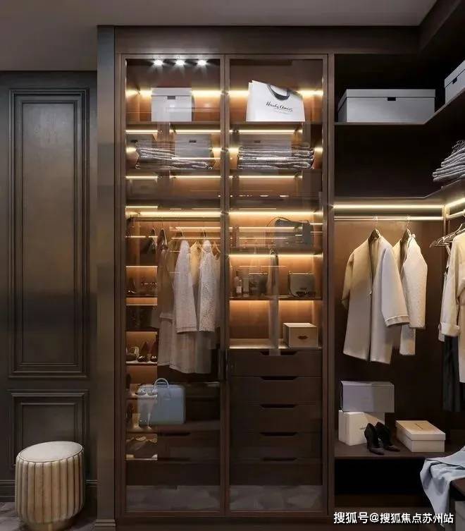 宽敞时尚的衣柜,这种衣柜由优质的木材制成,玻璃门和内置灯光,是非常实用且美观的。