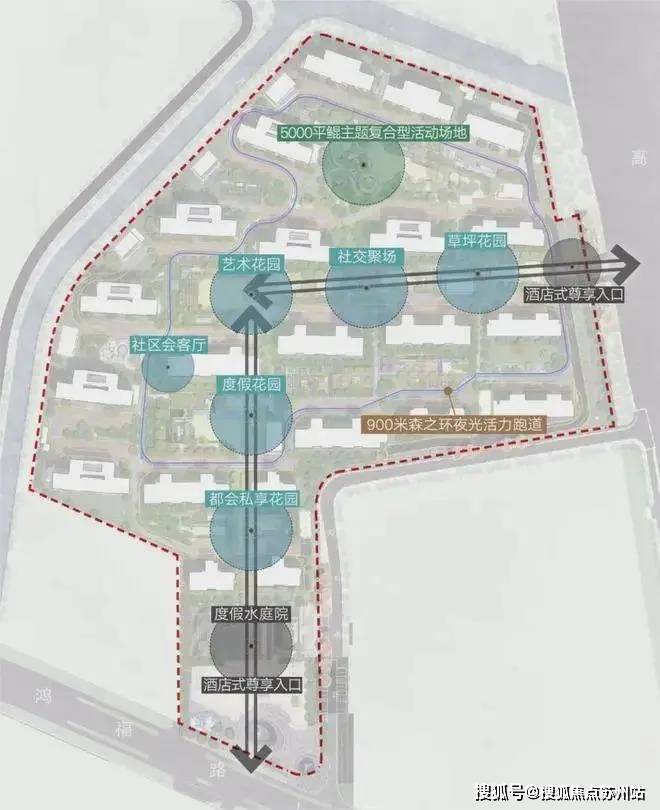 步入园区,迎面而来的约10000㎡度假式园林大境,中心度假花园、鲲主题复合型活动场地、都会私