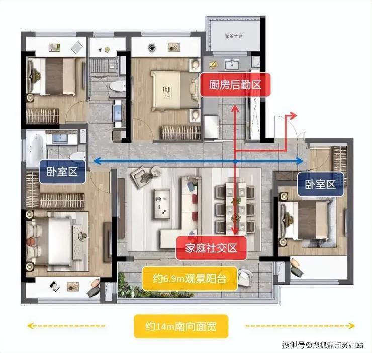 开间约6.9m的大横厅,在苏州市面同面积段赛道上也是出类拔萃,把景观阳台合并进室内后,LDK社交区面积更是堪比建面160㎡以上产品,生生把143㎡户型做出了十足的豪宅级客厅感。