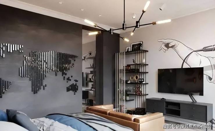 男孩的卧室,将房间布置成超想象力的空间,以世界地图的形式对灯给予了极大的关注,让人联想到夜空中飞机飞过窗户的情景。