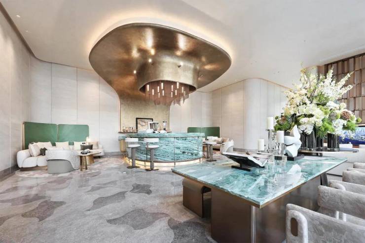 这处门庭采用贝金米黄石材、维多利亚绿、白雪公主奢石,结合古铜色金属板,形成冷暖撞色的张力美学,打开了城市奢度,每个细节透露出“贵”。