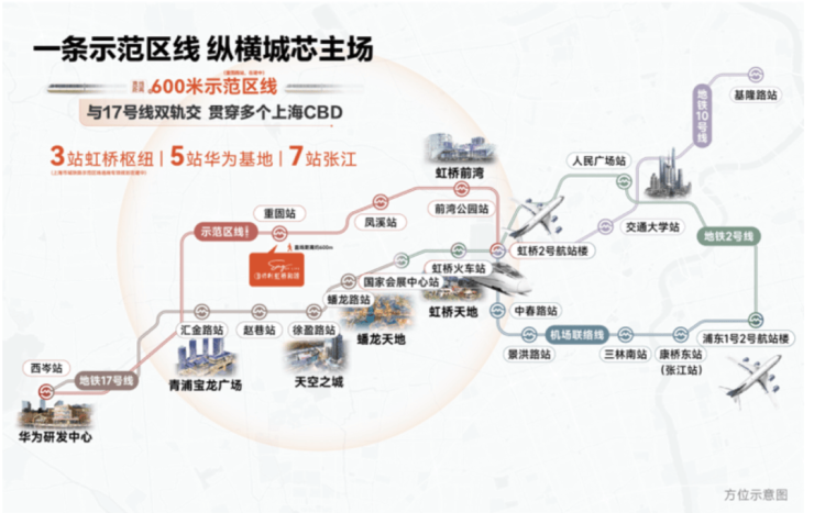 而示范区线(在建)左手长三角一体化、华为,右手前湾、大虹桥总部商办,并通过虹桥枢纽,串联2号线及正在试运营的机场联络线,把市中心、徐汇、闵行、张江等高能板块都纳入保利虹桥和颂·IN255的通勤版图。