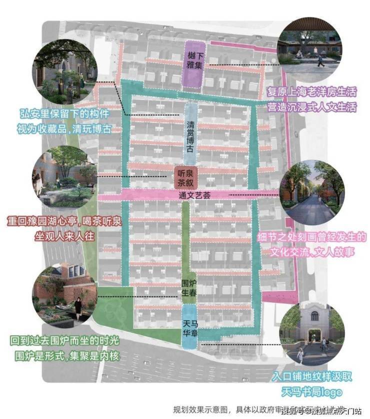 雅集六境:入园俯拾,开启百年天马华章;下沉庭院偶遇交谈,围炉生春;临水而憩,犹如豫园湖心亭听泉茶叙;随心漫步,清赏博古原址老构件;中庭樾下雅集,怀旧洋房的生活趣味;东西主轴的通文艺荟,植入文化故事,围上“人文”腰封。