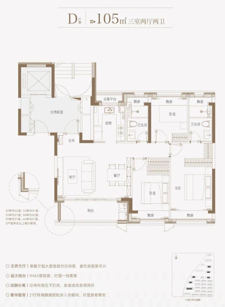 边套的餐厅、主卧和次卧,设置有多个270°全景飘窗,室内通透明亮。