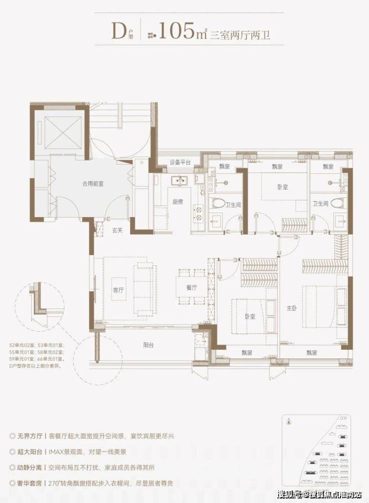 建面约139㎡上叠户型,三层是会客区,四层是居住区,阳台+露台+多个飘窗设计,附加空间非常大,在别墅类产品中实属罕见!