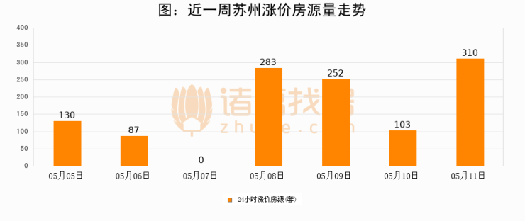 根据诸葛找房数据显示,苏州24小时涨价房源量为310套,较05月10日增加207套,环比上涨201%。与此同时,涨价房源占比小幅扩大,业主信心有所提升。