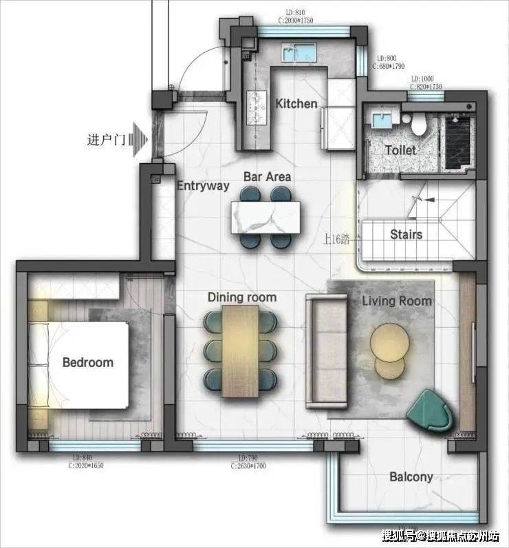 玄关柜设计挑空及敞开格满足日常使用需求;设计水吧台,满足简餐需求,客餐厅一体化,使得空间更加通透、敞亮